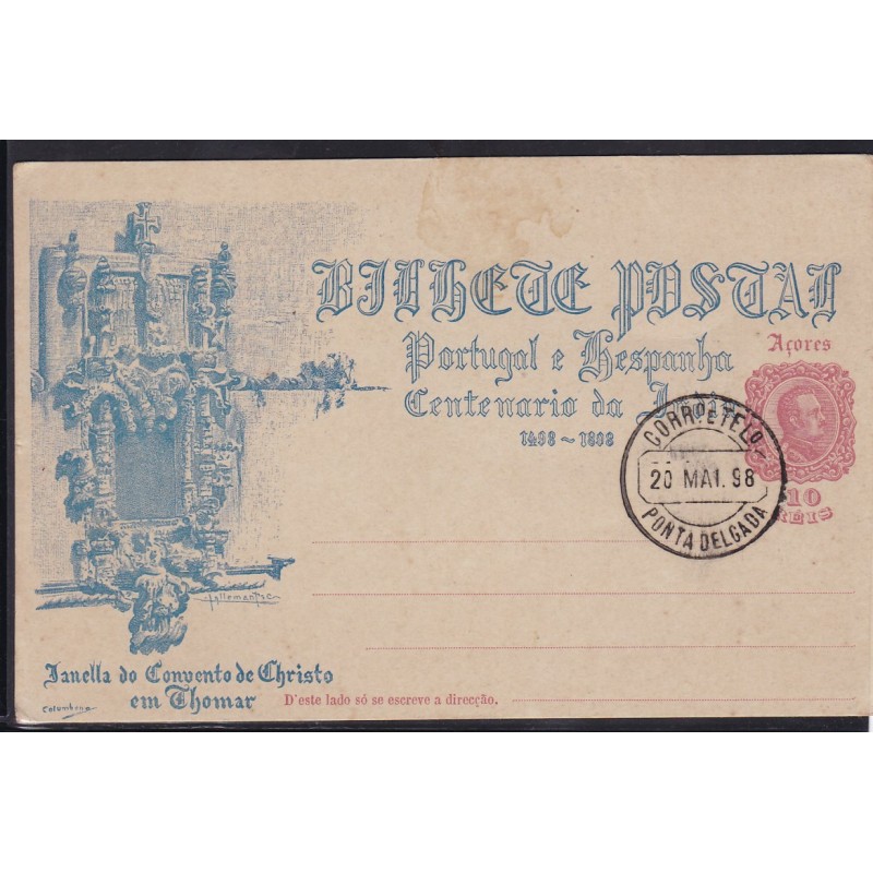 Inteiro Postal nº 20E (1 de Abril) com sobrecarga Açores, "Janella do Conventode Christo em Thomar" azul.