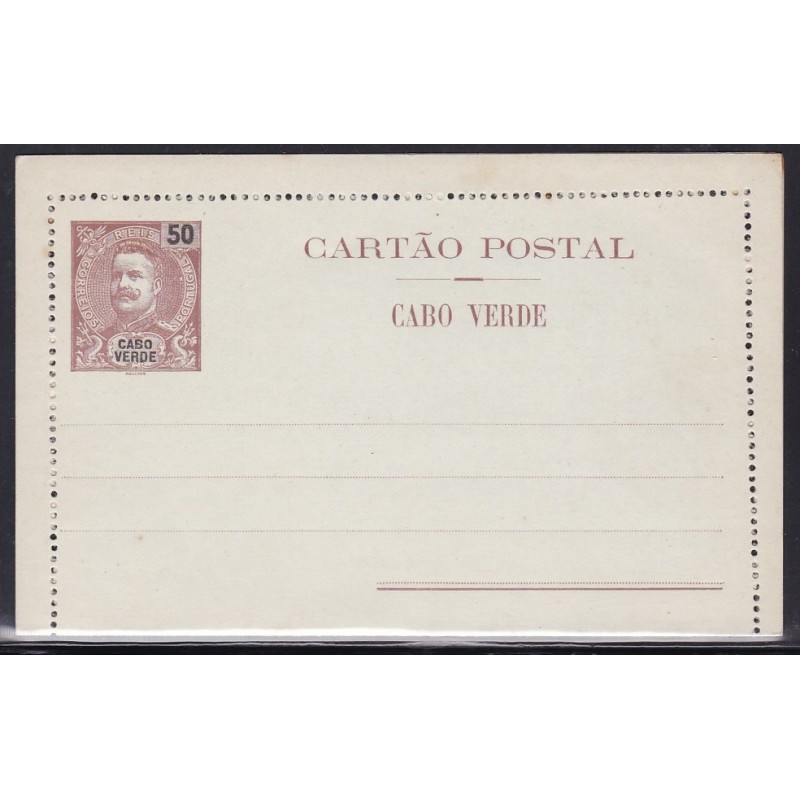 Cartão Inteiro Postal nº2, 50 reís castanho (cartolina azul cinzenta, interior creme).