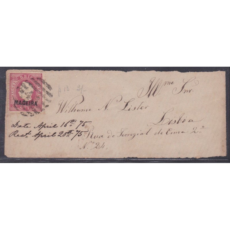 Carta circulada em 19 de maio 1870 com passagem por Lisboa a 23 de maio e marca de chegada a Paris a 27 de Maio. Carta com selo de 80 réis de D. Luís Fita curva não dentedo. Exemplar em boas condições.