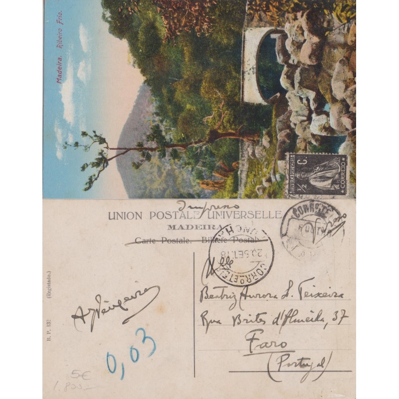 Postal circulado do Funchal para Faro com multa