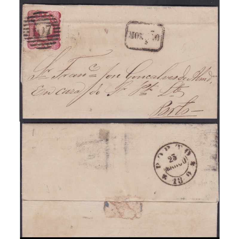 Carta circulada com carimbo Nominativo batido a preto "Monção", em 21 de Março de 1860 e marca de chegada a 23 de Abril. Com selo de D. Pedro V cabelos anelados 25 réis. Exemplar em boas condições.
