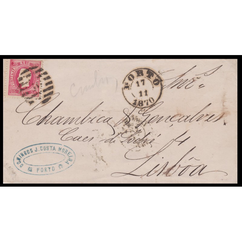 Carta circulada em 17 de Novembro de 1870 com carimbo de Barras para Lisboa. Com selo de D. Luís I fita curva de 25 réis. Exemplar em boas condições.