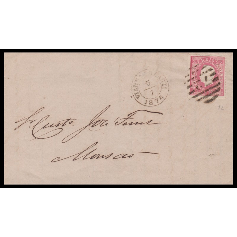 Carta circulada em 3 de Julho de 1874 para Moção. Com selo de D. Luís I fita direita de 25 réis e denteado 12½. Exemplar em boas condições.