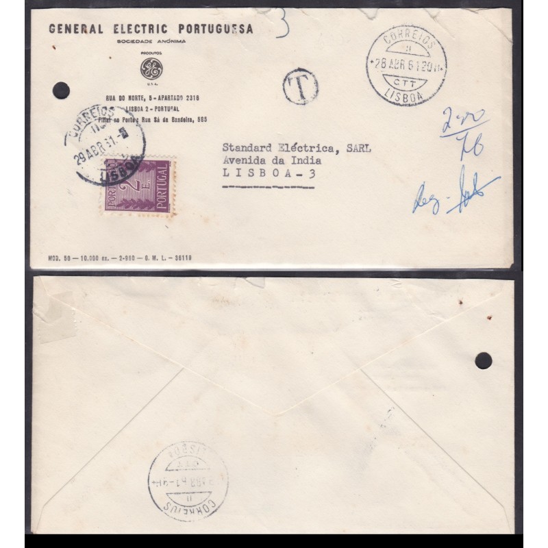 Carta circulada em 28 de Abril de 1961. MULTADA à chegada com selos de porteado do Continente. Exemplar em boas condições.