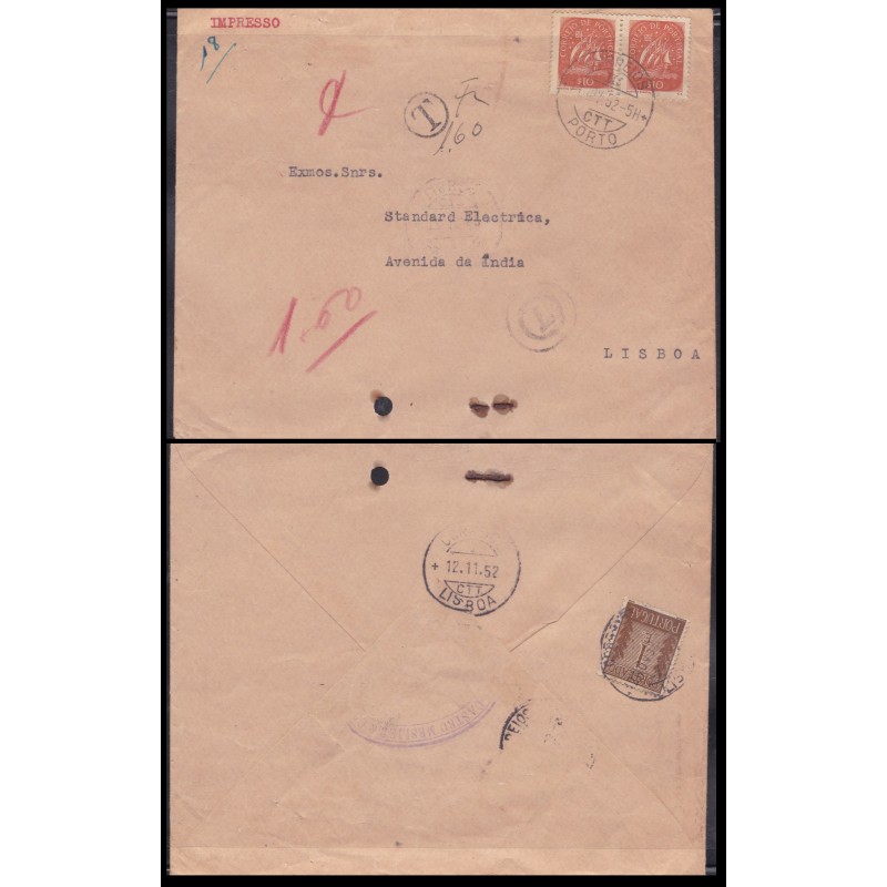Carta circulada em 10 de Novembro de 1952. MULTADA à chegada com selos de porteado do Continente. Exemplar em boas condições.