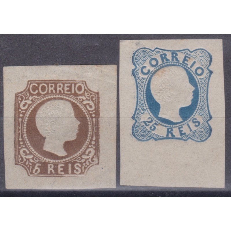 Reimpressões de 1863 da serie nº 10 e nº 12 com charneira. Exemplar de 25 reis com pequena mancha de oxido.